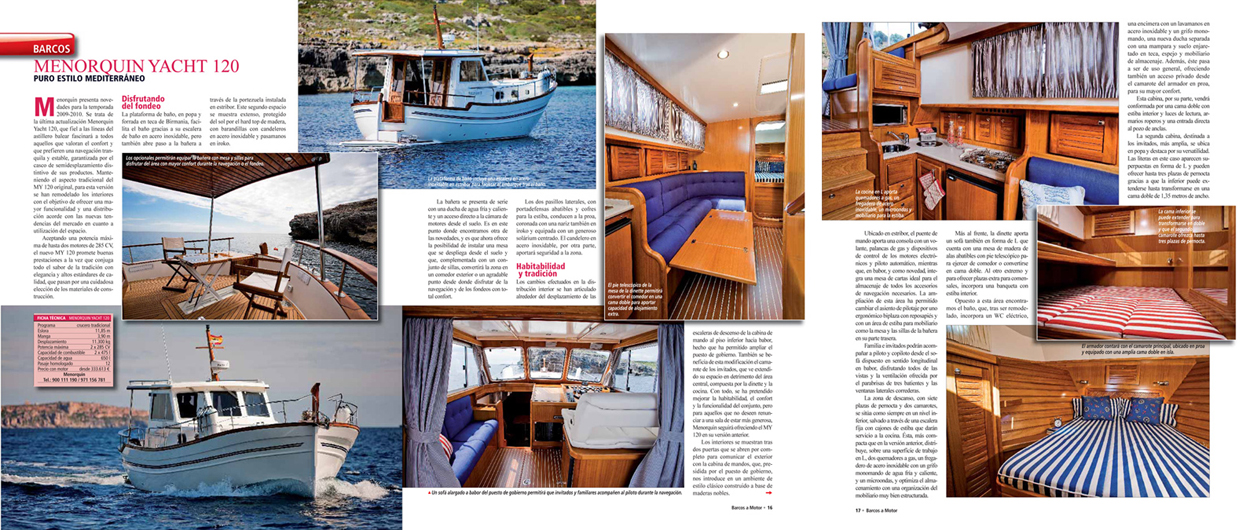 La revista «Barcos a motor» en su número de agosto publica un amplio reportaje del modelo MY120, con fotos realizadas en uno de los últimos trabajos para el astillero menorquín.